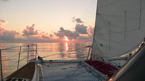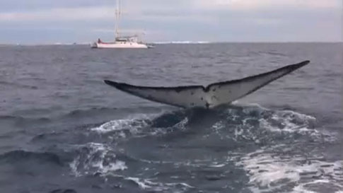 Yes, twice. The first time was off Palmerston Island in the middle of the Pacific when a mother and baby came to see the 4 boats moored off the island. The second was a magical visit in the middle of the Indian Ocean in the black of night and underway, when a whale placed herself between the two hulls and swam with Shearwater for well over an hour.